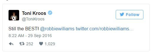 Mas todas essas medalhas não são nada em comparação com o verdadeiro amor de Kroos - a música de Robbie Williams.